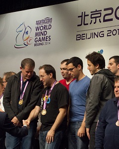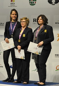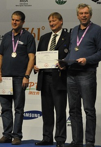 The European players swept the board in the Individual Championship at the SportAccord World Mind Games. In the Open Geir Helgemo (Monaco) took Gold and Tor Helness (also Monaco) together with Ophir Herbst (Israel) tied for the silver medal. The picture shows Yves Aubry, Vice President of the WBF accepting the gold medal on behalf of Geir Helgemo who unfortunately had to leave for his plane.