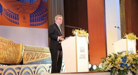 The Opening Ceremony was a night of Thai culture and hospitality at the Royal Thai Navy Convention Hall on the banks of the Chao Praya River, attended by all the representatives of 92 IFs member of GAISF. Hosted by the Sport Authority of Thailand and the Ministry of Sport of Thailand the Ceremony – started with welcoming speeches of the Prime Minister of Thailand Mr. Prayut Chan-o-cha, the President of SportAccord and GAISF Mr. Patrick Baumann and the IOC President Mr. Thomas Bach – was full of leaders of sport and politics, including President of Asian Olympic Council Ahmed Al-Fahad Al-Ahmed Al-Sabah, President of WADA Craig Reedie, Minister of Sport and Tourism in Thailand Weerasak Kowsurat, President ASOIF Francesco Ricci Bitti, President of Peace and Sport Joel Bouzou, President of Fédération Internationale de Médécine du Sport Fabio Pigozzi and guests from UN Women, UNESCO, Right To Play. The guests were welcomed with a demonstration of Thai traditions and culture.