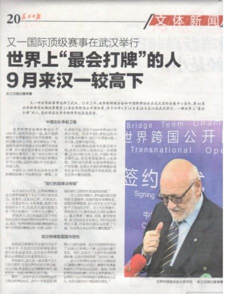 (including Bermuda Bowl, Venice Cup, d’Orsi Trophy and Mixed Teams) and the 12thWorld Transnational Open Teams has held at the Wuhan Convention Center.
