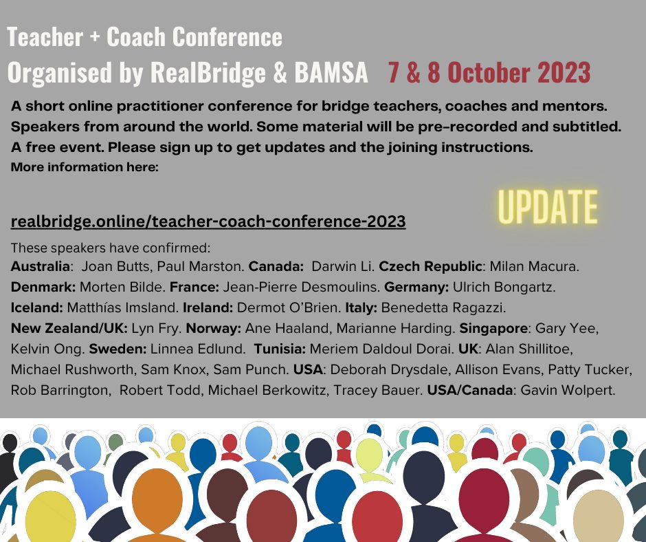 This is a reminder about the forthcoming teacher/coach conference organised by RealBridge and BAMSA. The conference will feature speakers from all around the world, on a range of topics that will be useful to teachers and coaches. It takes place on 7th and 8th October 2023.